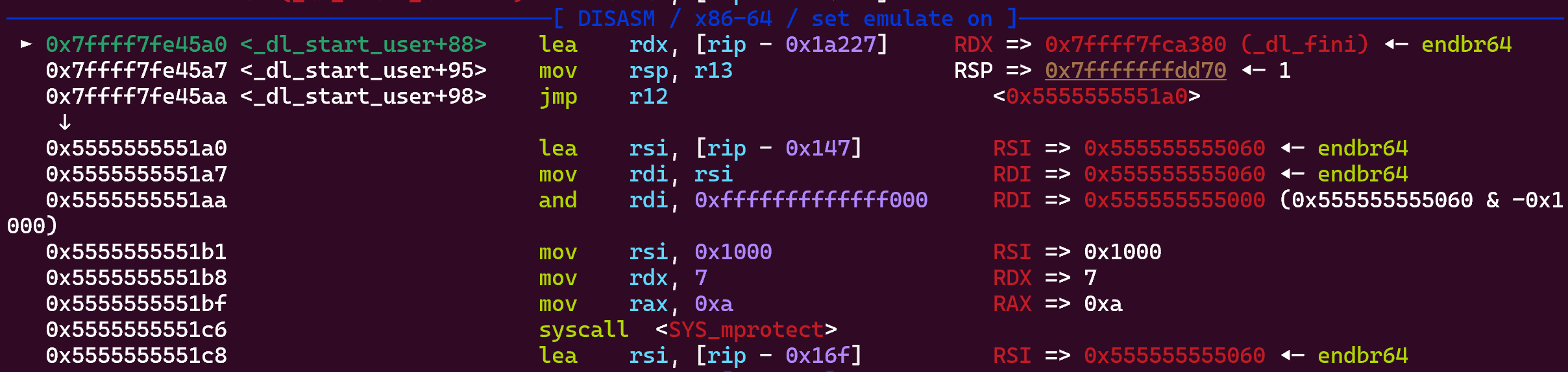 0b:0058│ 0x5555555551f8 ◂— syscall