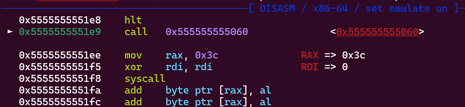 09:0048│ 0x5555555551e8 ◂— hlt