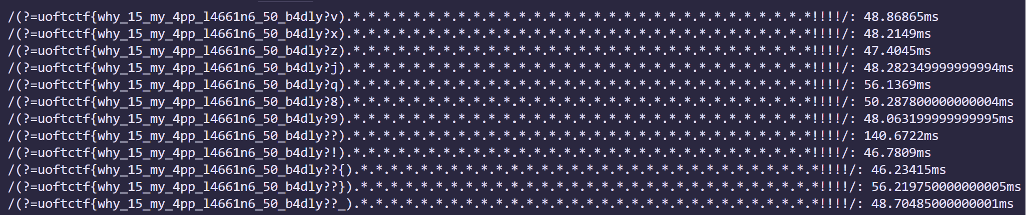print(f'/(?={flag+ch}).*.*.*.*.*.*.*.*.*.*.*.*.*.*.*.*.*.*.*.*.*.*.*.*.*.*.*.*.*.*.*!!!!/: {average}ms')